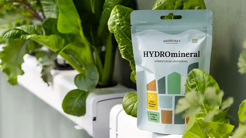 Nackdelen med mineralisk växtnäring är att råvarorna ofta bryts i gruvor eller produceras genom energiintensiva processer, vilket ger ett större klimatavtryck. På Grobruket har vi därför valt att arbeta med råvaror som antingen utvinns ur organiskt material eller är restprodukter från annan livsmedels- eller industriell produktion när vi tillverkar vår växtnäring Hydromineral. Dessa råvaror har samma odlingseffekt som traditionella, men med avsevärt lägre miljö- och klimatpåverkan.