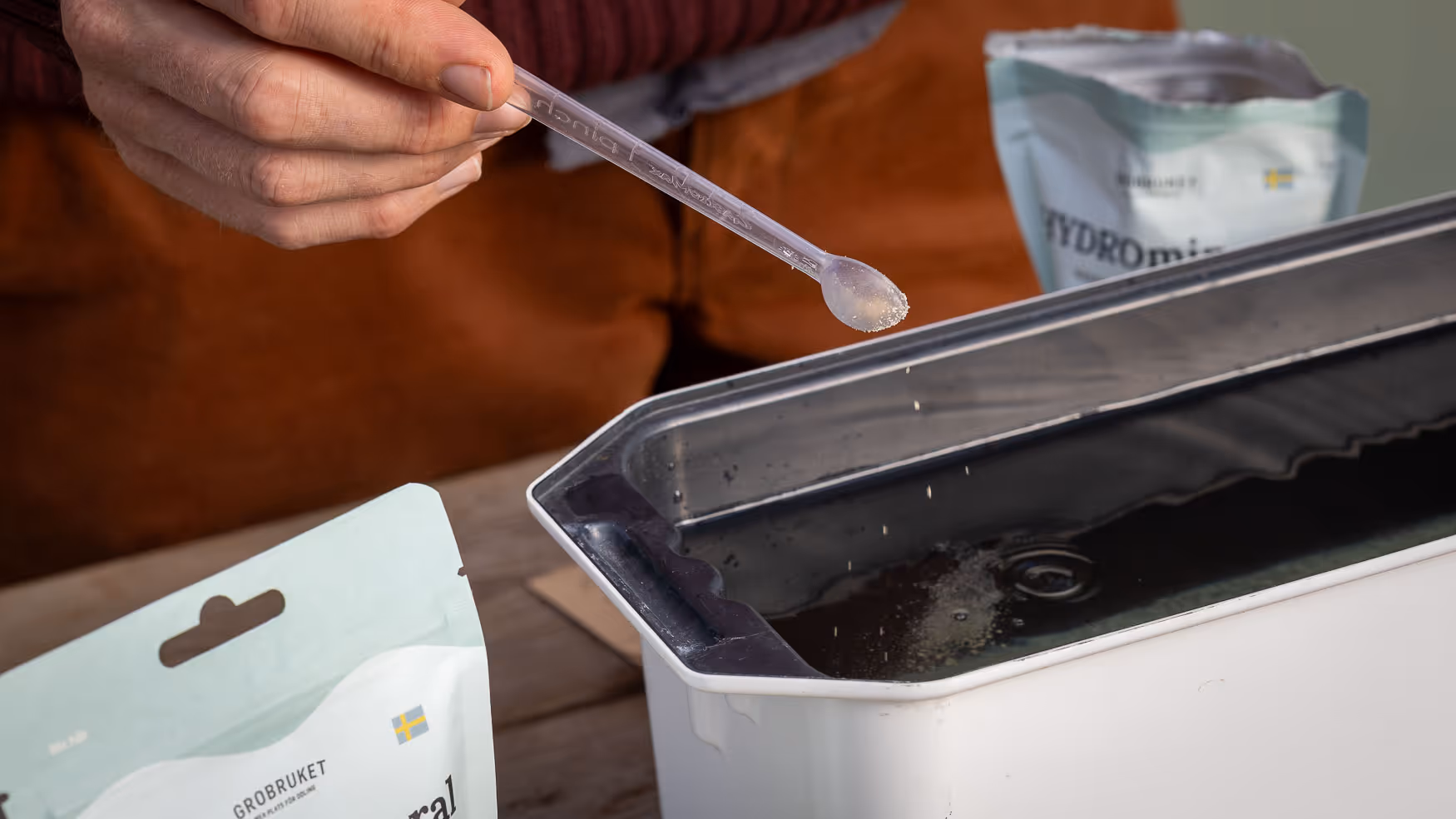 Tillsätt Hydromineral varje gång du fyller på vatten i ditt system. Häll upp rätt mängd i en vattenkanna eller behållare – till exempel 1,5 krm per liter vatten – rör om tills pulvret löst sig och fyll sedan på ditt hydrosystem. Om du mäter EC kan du istället justera till önskat värde direkt i lösningen.